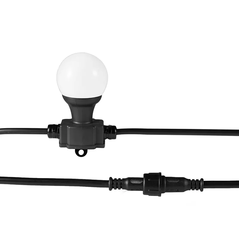 Struna aj samostatné žiarovky majú krytie IP54, odolné voči prachu a striekajúcej vode pre stabilné použitie v miernych vonkajších podmienkach (napríklad záhradné párty, terasy) a vo vnútorných priestoroch.